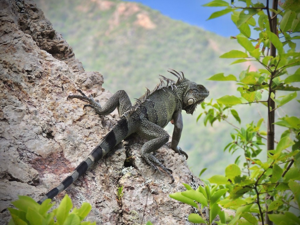 The green iguana is a large lizard and is the largest species in the iguana family. On islands such as Bonaire, Curaçao, Aruba, and Grenada, a green iguana’s colour may vary from green to lavender, black, and even reddish brown.