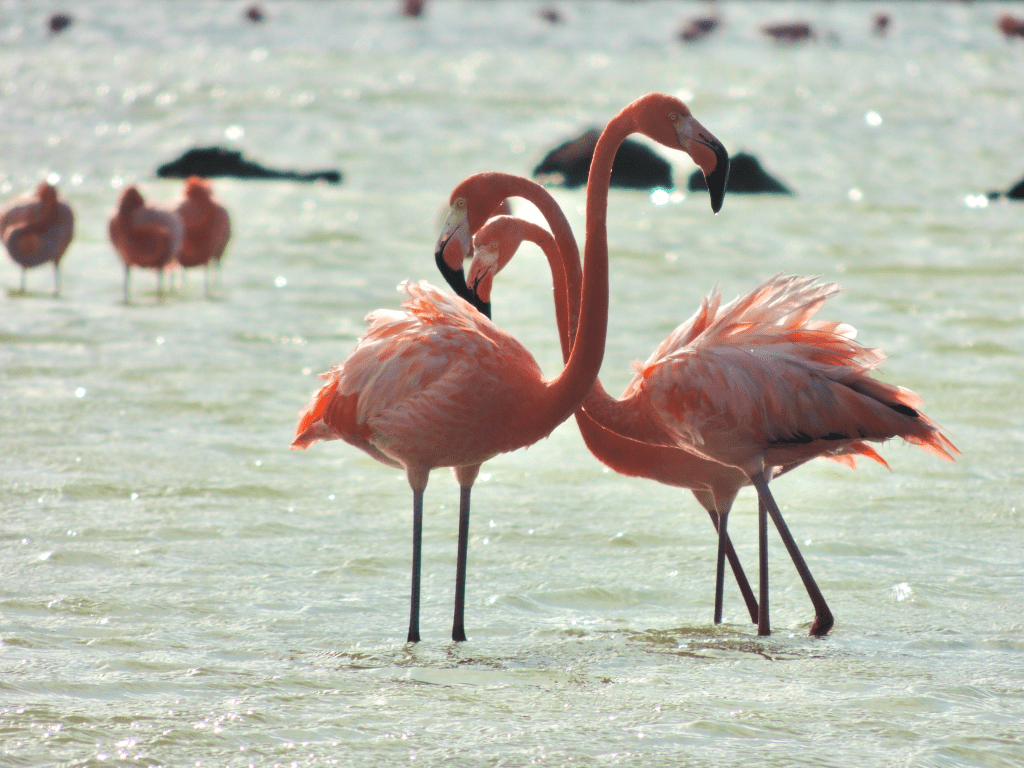 The American flamingo’s preferred habitats are similar to those of its relatives: saline lagoons, mudflats, and shallow, brackish coastal lakes. They frequent Curaçao’s salt flats.