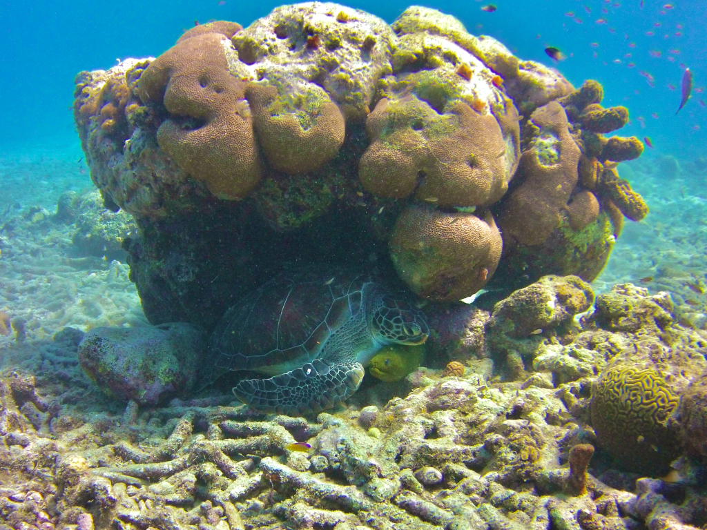 This green turtle chose an unlikely friend for his nap- a moray eel. Green turtles can rest for up to 11 hours each day.