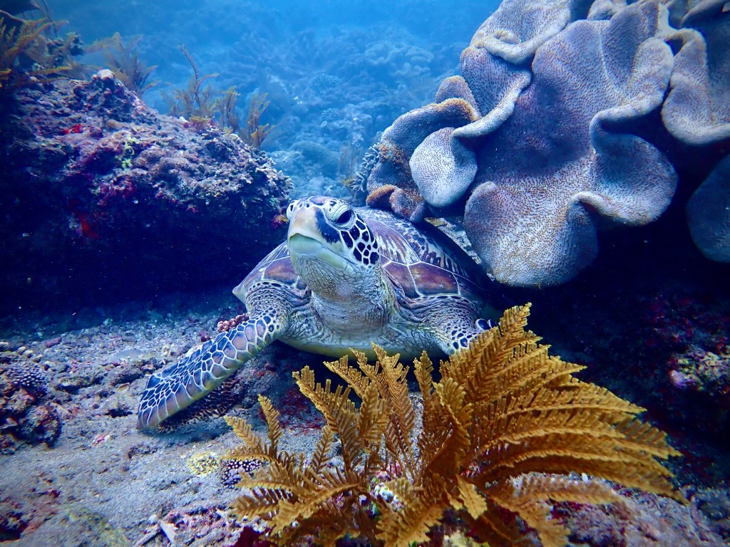 This green sea turtle lounges under a coral overhang, a common sight in Bali’s waters, where strong currents bring a buffet of seagrass and jellyfish.