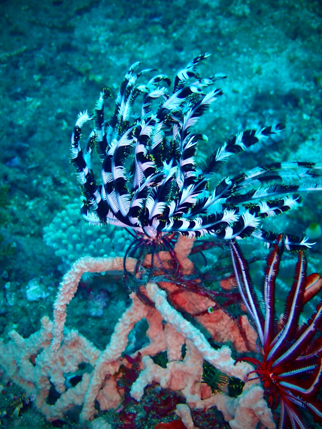 The black-and-white feathery organisms on the soft coral are crinoids, ancient marine animals related to sea stars that use their feathery arms to filter plankton from the water.
