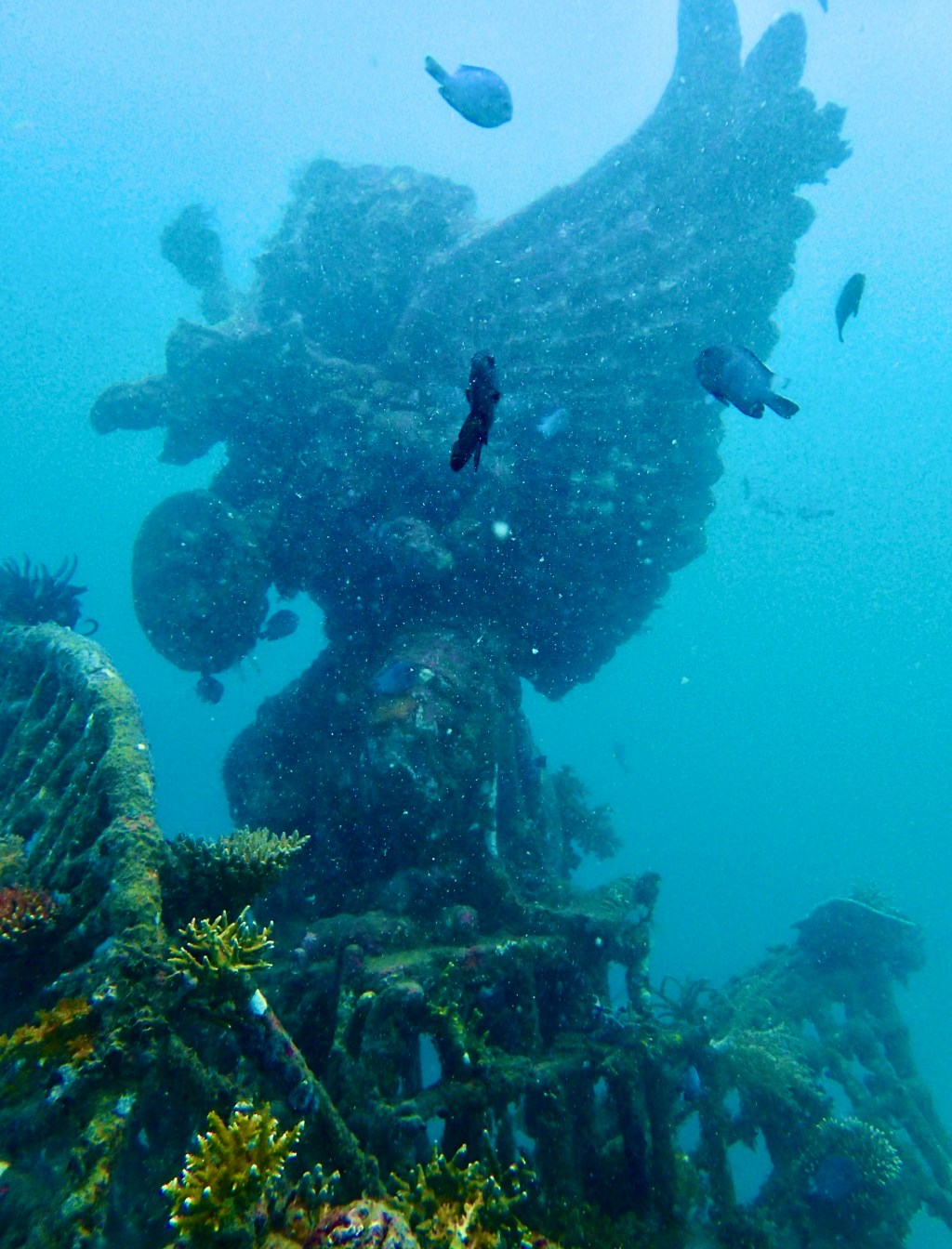 The sunken statues in Pemuteran are modern installations that use a gentle Biorock electric current to help coral grow faster and rebuild the reef.
